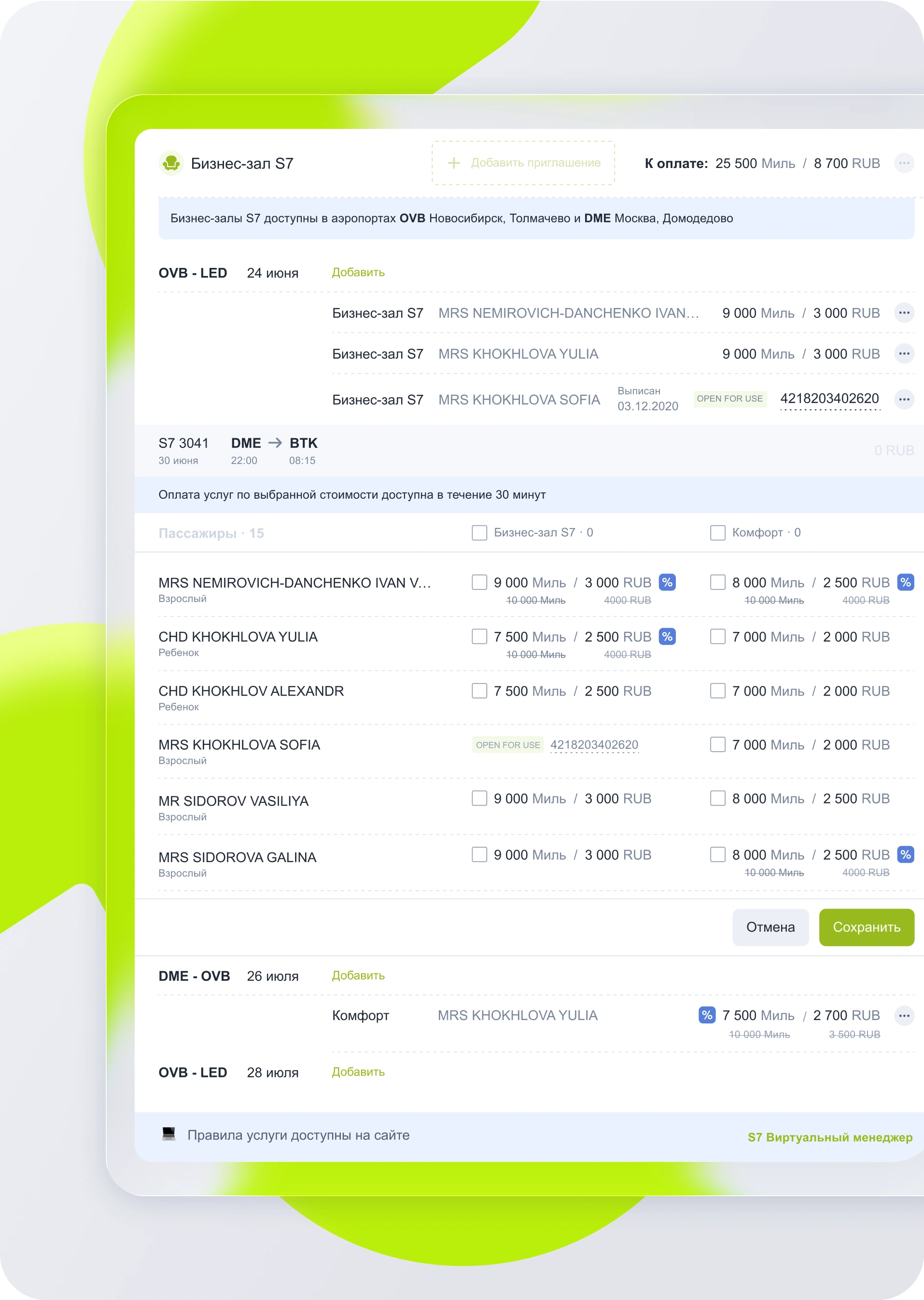 Для группового бронирования до 15 человек важно, чтобы сотрудник бизнес-зала мог быстро и удобно рассадить всех пассажиров разом. Интерфейс показывает всю схему сразу: места наглядно перед глазами, выбор можно при необходимости отредактировать. Это позволяет кассиру сразу озвучить итоговую стоимость и ускоряет процесс обслуживания.