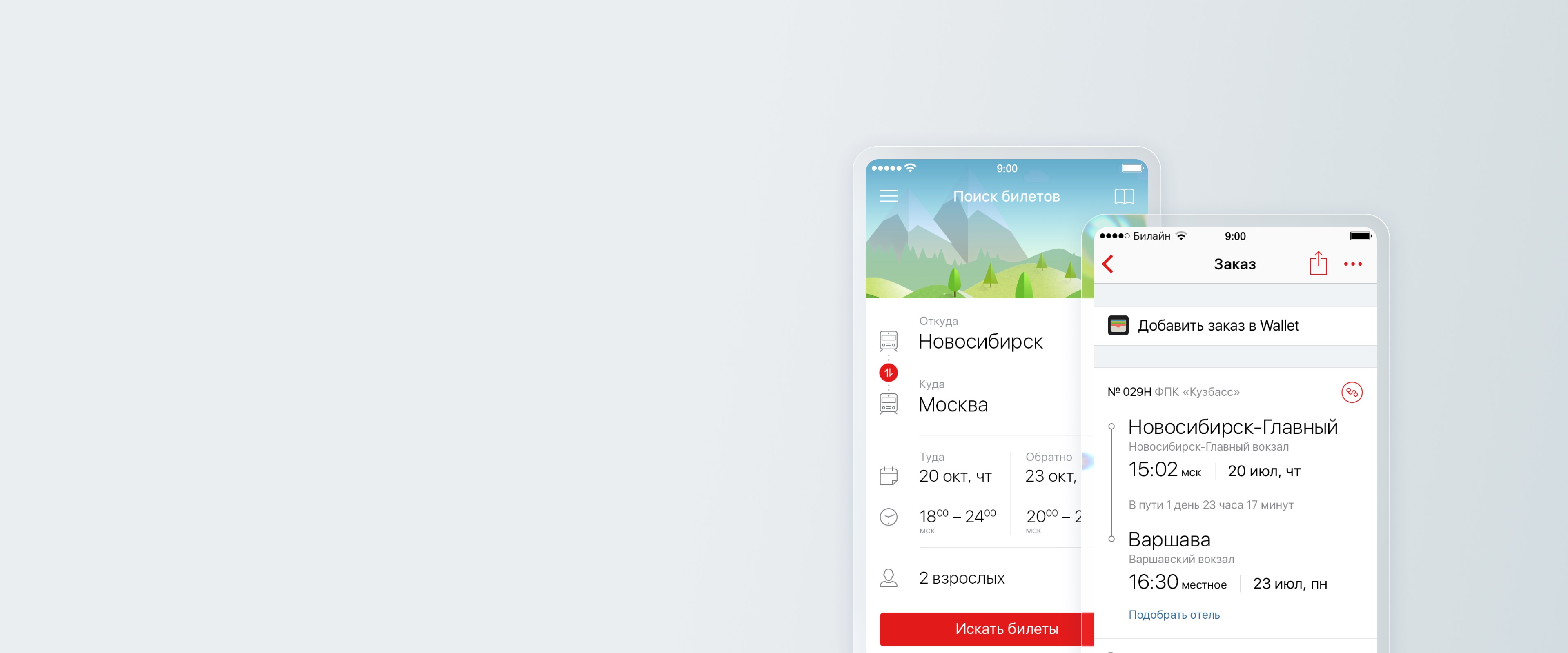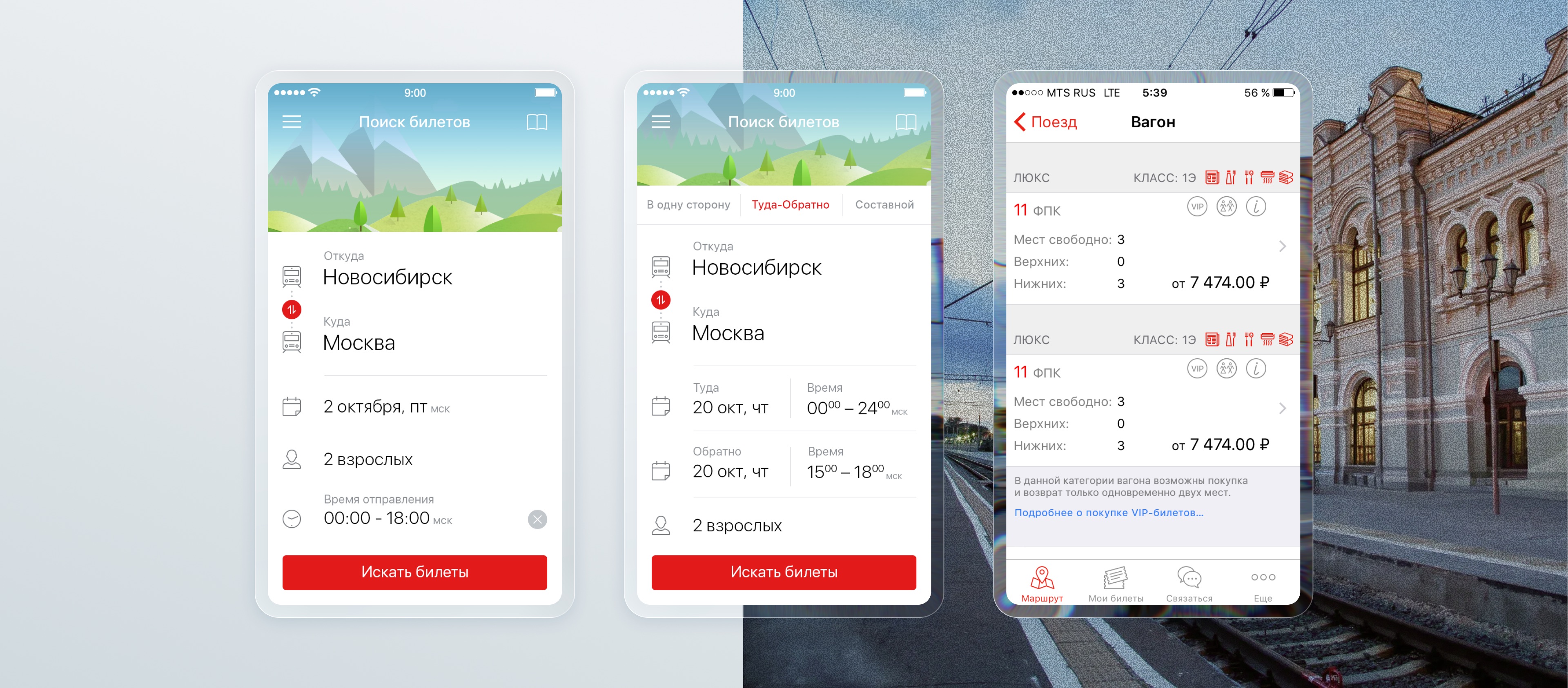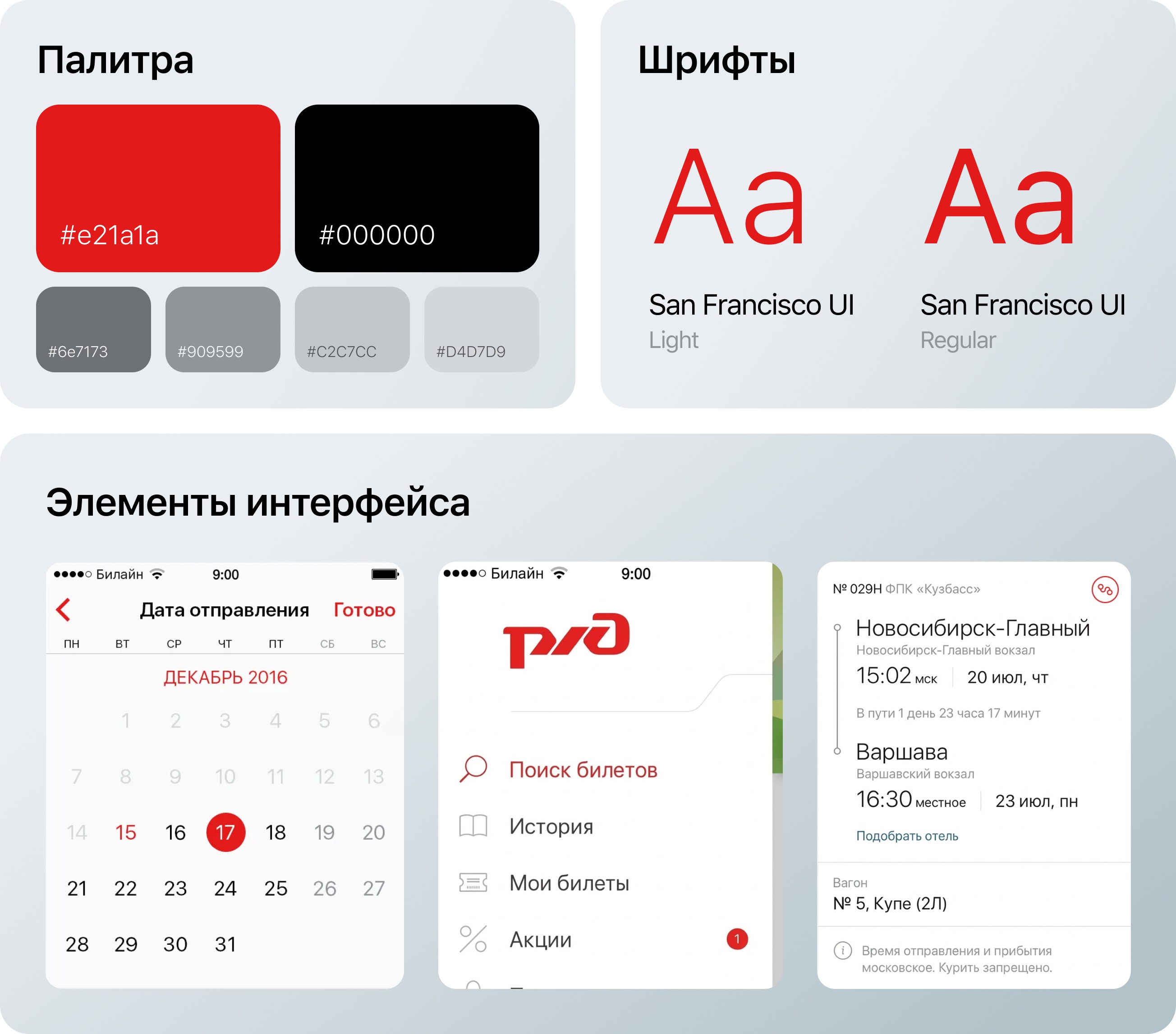 Интерфейс приложения наследует узнаваемый фирменный стиль РЖД, поддерживая ощущение единой экосистемы сервисов компании и повышая доверие пользователей к цифровому каналу покупки билетов.
