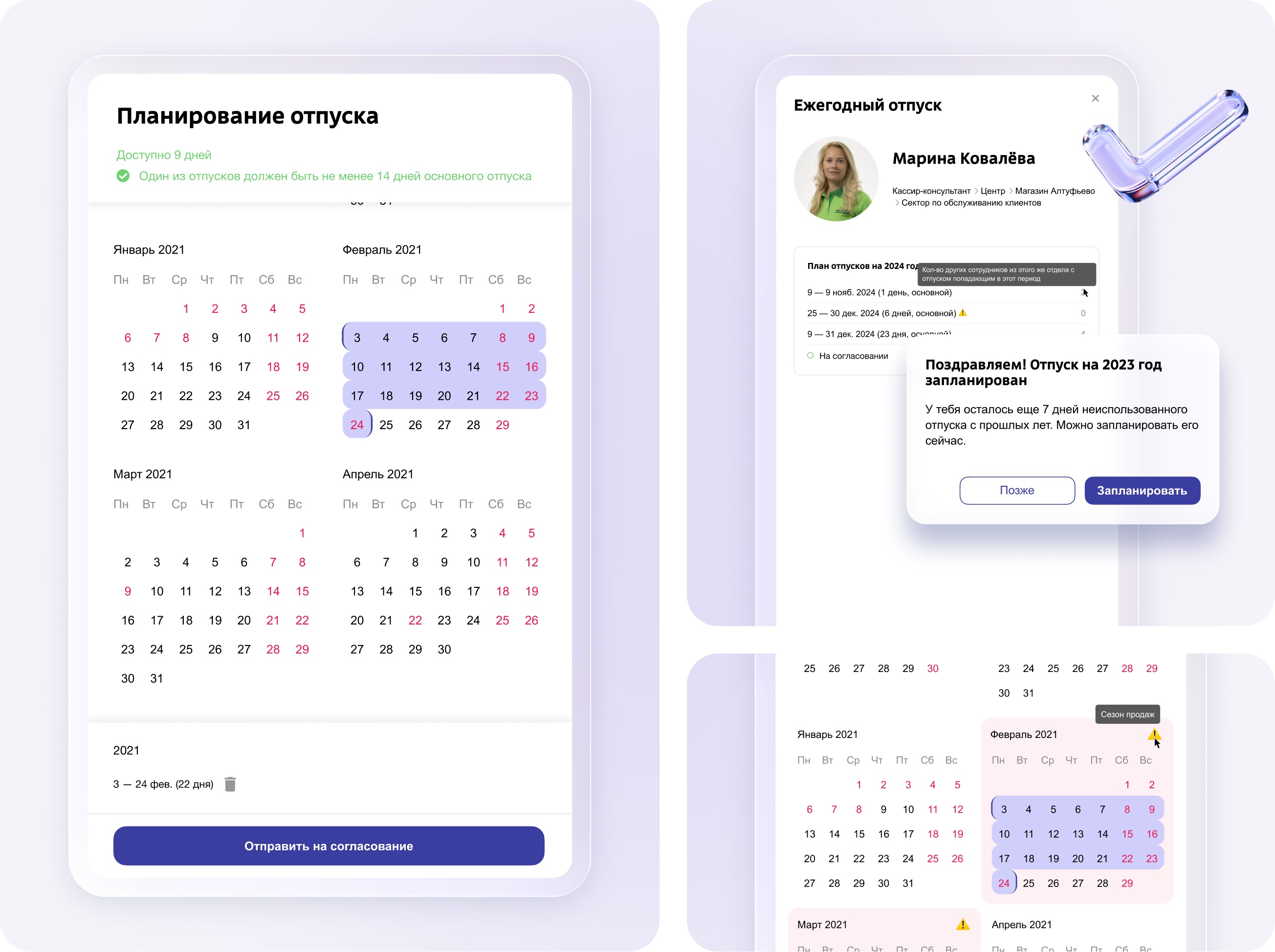 В компании работают сотрудники разного возраста и уровня владения компьютером. Сервис должен быть одинаково понятен всем. При этом, помимо требований законодательства, действуют внутренние регламенты: дополнительные дни отдыха, ограничения и корпоративные условия. Важно, чтобы правила были прозрачны, а система помогала им следовать и исключала ошибки.