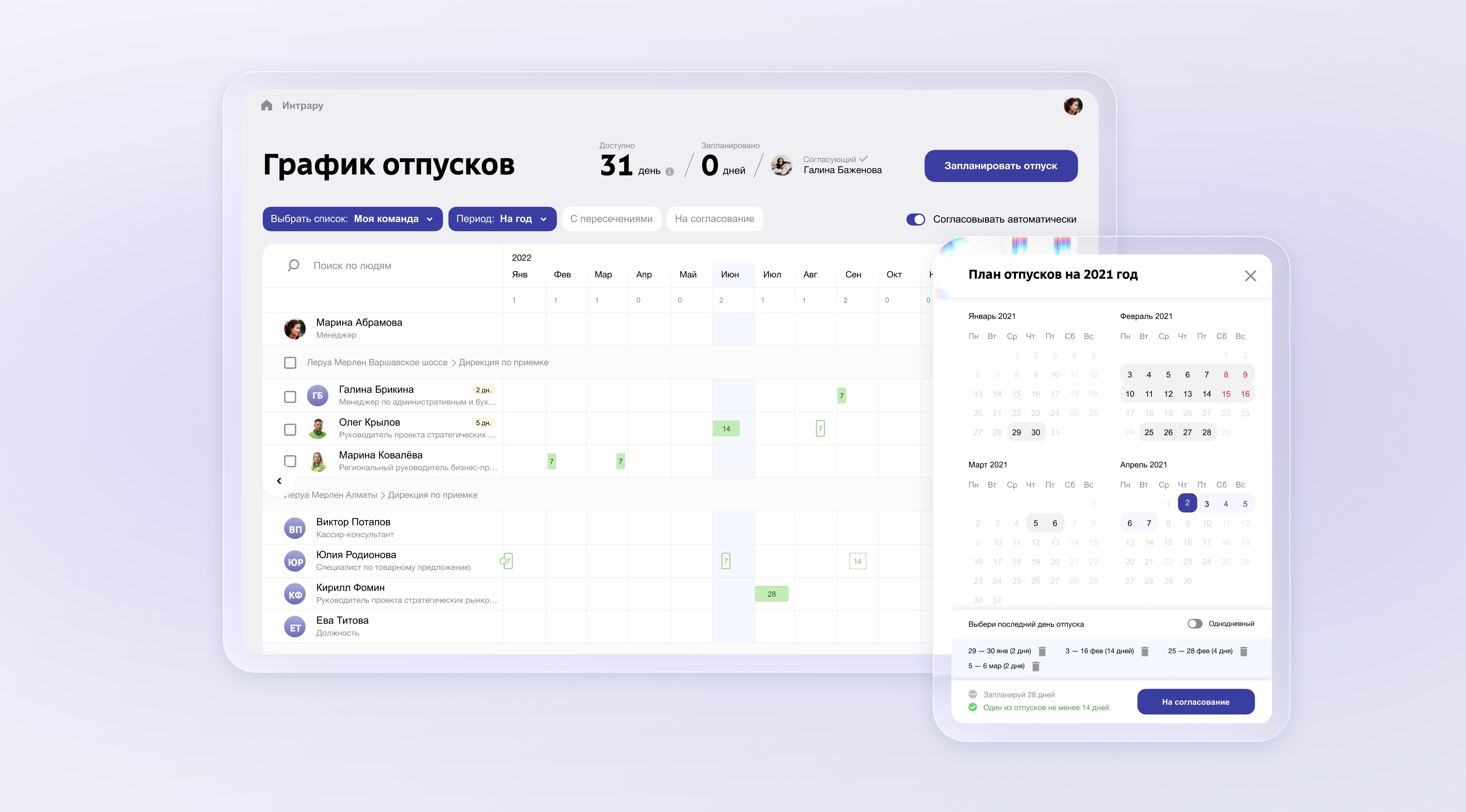 Решение позволяет руководителям управлять загруженностью отдела, а сотрудникам планировать отпуск с учётом графика коллег и сезонности продаж.