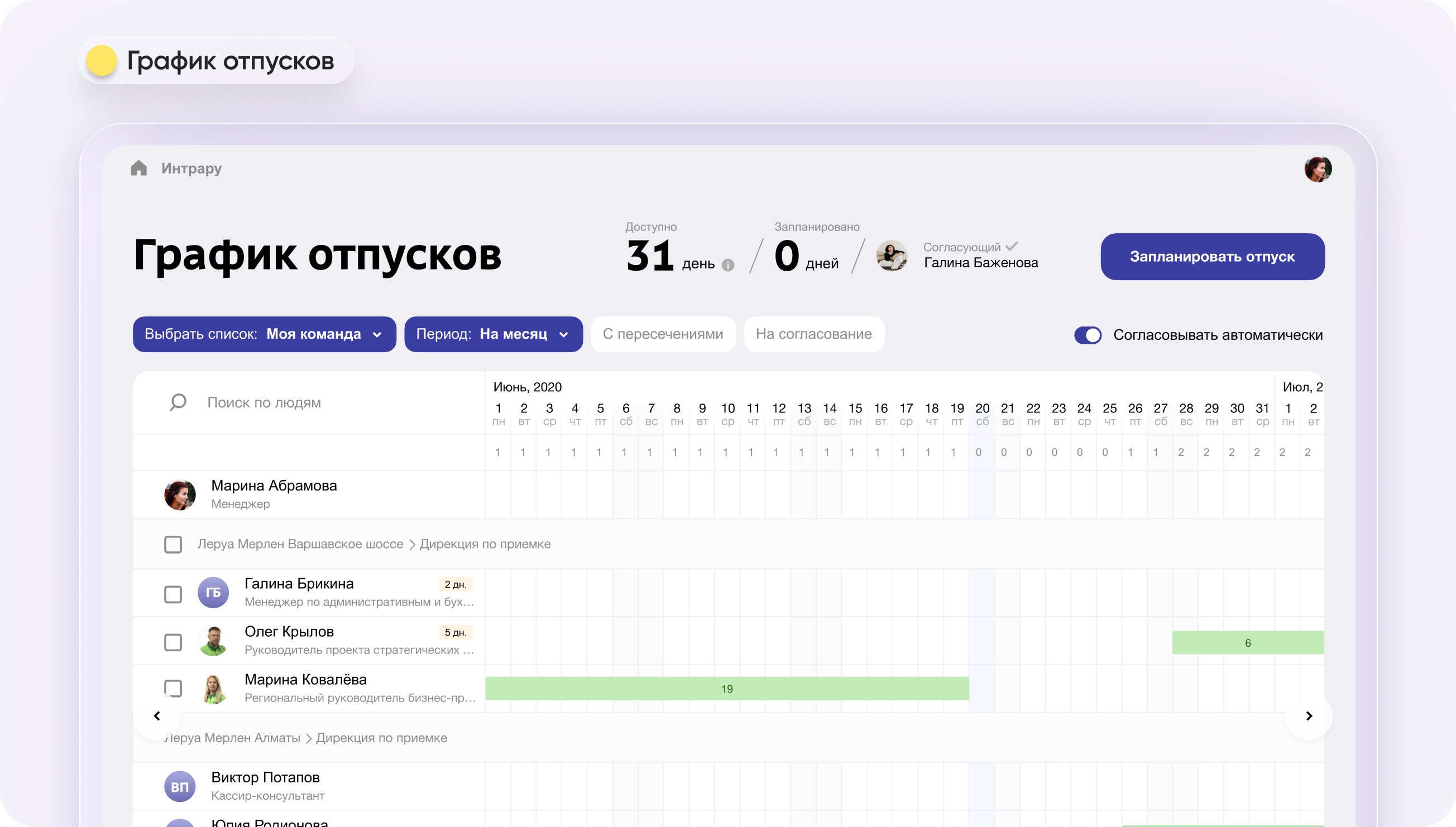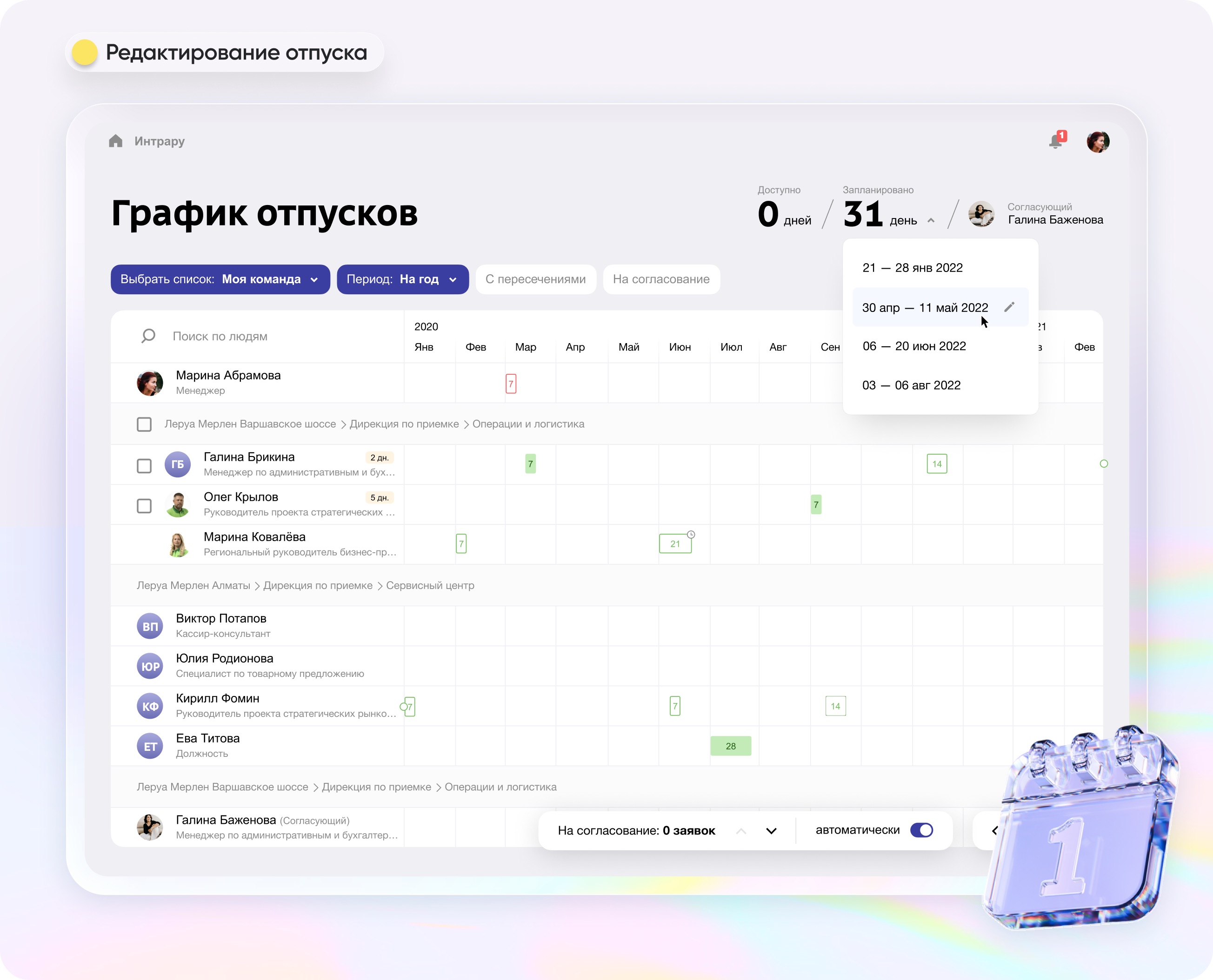 Мы сделали график отпусков наглядным: цветовая индикация и система обозначений позволяют сразу видеть статус отпусков. Руководители могут управлять списком сотрудников на графике, чтобы быстрее находить пересечения внутри нужной группы людей. Переключение масштаба графика между годом и месяцем помогает менять перспективу и точнее оценивать загрузку команды. При необходимости можно включить автоматическое согласование, когда процесс больше не требует ручного контроля.
